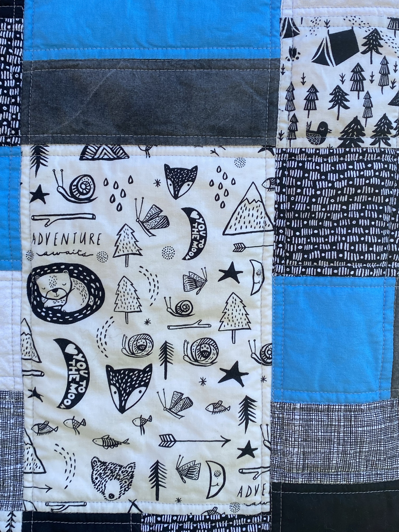 It was made with my own design from leftovers from my Little Critters baby quilt; I really wanted to make use of the last bits of the camping/woodland creatures prints, and had to come up with a design that would allow for a mix of large blocks, strips and squares to make the most of the pieces of fabric that I had.